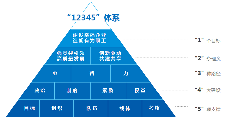 作为全市第一批产业工人队伍建设改革试点企业,立足集团实际、积极探索实践、争创特色品牌,构建“12345”工作体系,即:围绕“建设幸福企业,造就有为职工”一个目标,坚持“党建引领高质量发展、创新驱动共建共享”两条理念,明确“心、智、力”三种路径,实施“政治、制度、素质、权益”四大建设,落实“目标、组织、队伍、载体、考核”五项支撑,全面推进集团产业工人队伍建设改革。