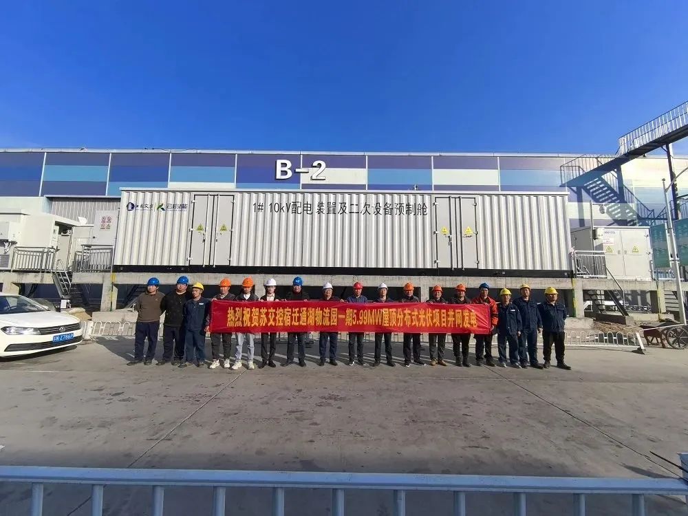通湖物流园屋顶分布式光伏一期项目利用园区7栋建筑物屋顶,装机容量为5.99MW,消纳方式为“自发自用、余电上网”,采用575Wp单晶硅组件平铺安装及10kV分两点并网发电,年发电量预计为602.38万kWh。自2023年10月开工建设以来,通湖物流园始终以“严、细、快、实”的工作作风全力推进项目建设,科学合理安排施工,有序做好现场施工组织管理,联合各相关单位全力冲刺并网目标,跑出了发展“新速度”。