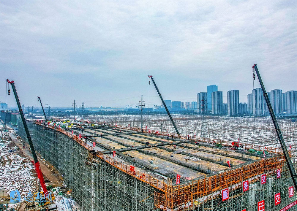2月28日,在宿迁市酒都路(原张家港大道一期)快速化改造工程现场,施工器械不断运转,工人正在紧张施工。