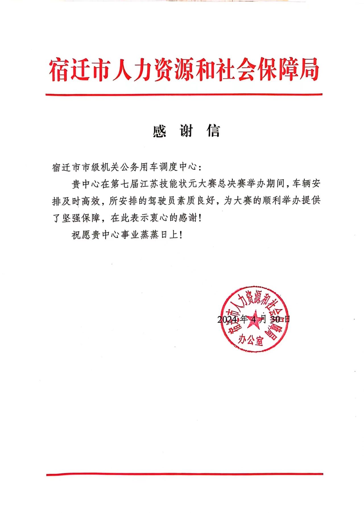 4月30日,宿迁市人力资源和社会保障局将一封感谢信送至恒通租赁(公车调度中心),对恒通租赁(公车调度中心)在本次活动保障过程中安全、高效的服务品质和专业、用心的工作态度表示感谢。