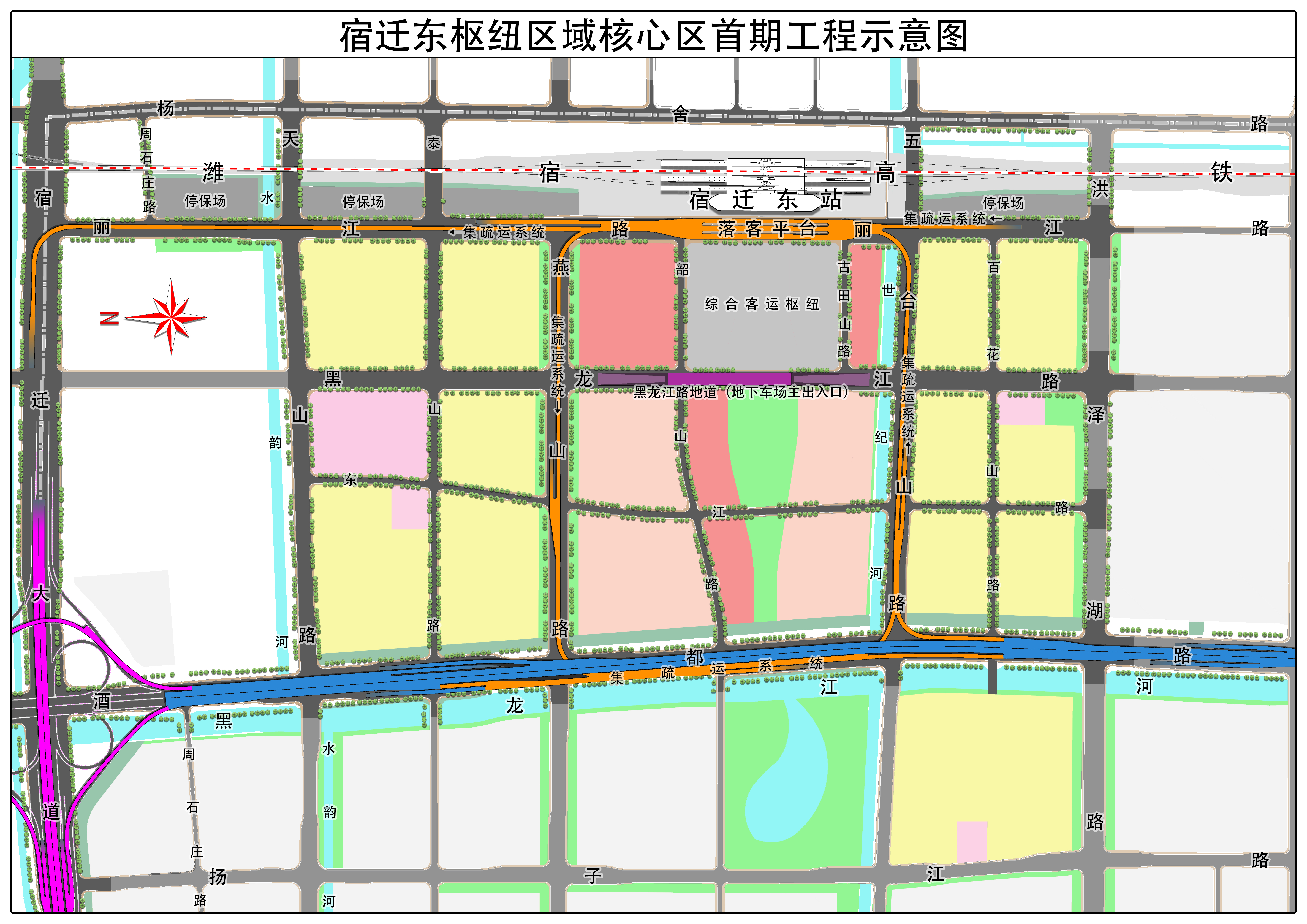 宿迁东枢纽区域核心区首期工程项目涵盖五台山路、丽江路、燕山路高铁集输运进出站高架工程、核心区过铁通道、市政路网、停保场等工程。首期工程项目的实施,将有助于构建高铁宿迁东站集疏运体系,完善核心区市政路网、管网、水利等设施,为核心区开发建设提供必要的基础设施条件。