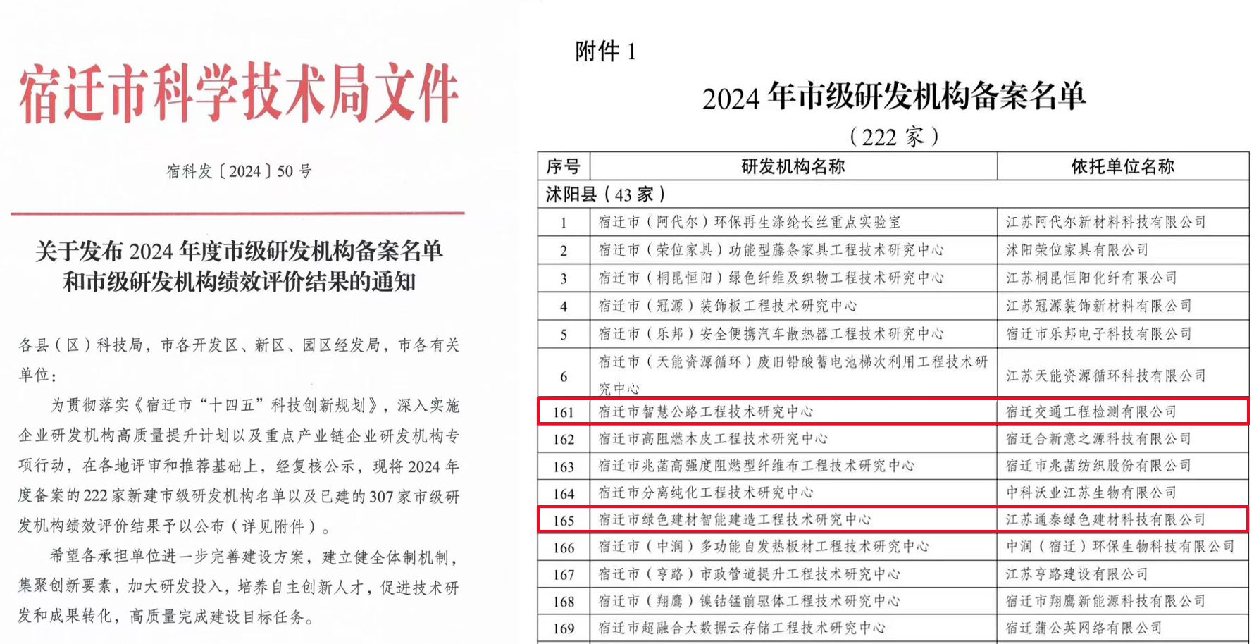 工程检测有限公司申报的“宿迁市智慧公路工程技术研究中心”、江苏通泰绿色建材科技有限公司申报的“宿迁市绿色建材智能建造工程技术研究中心”被认定为市级研发机构。