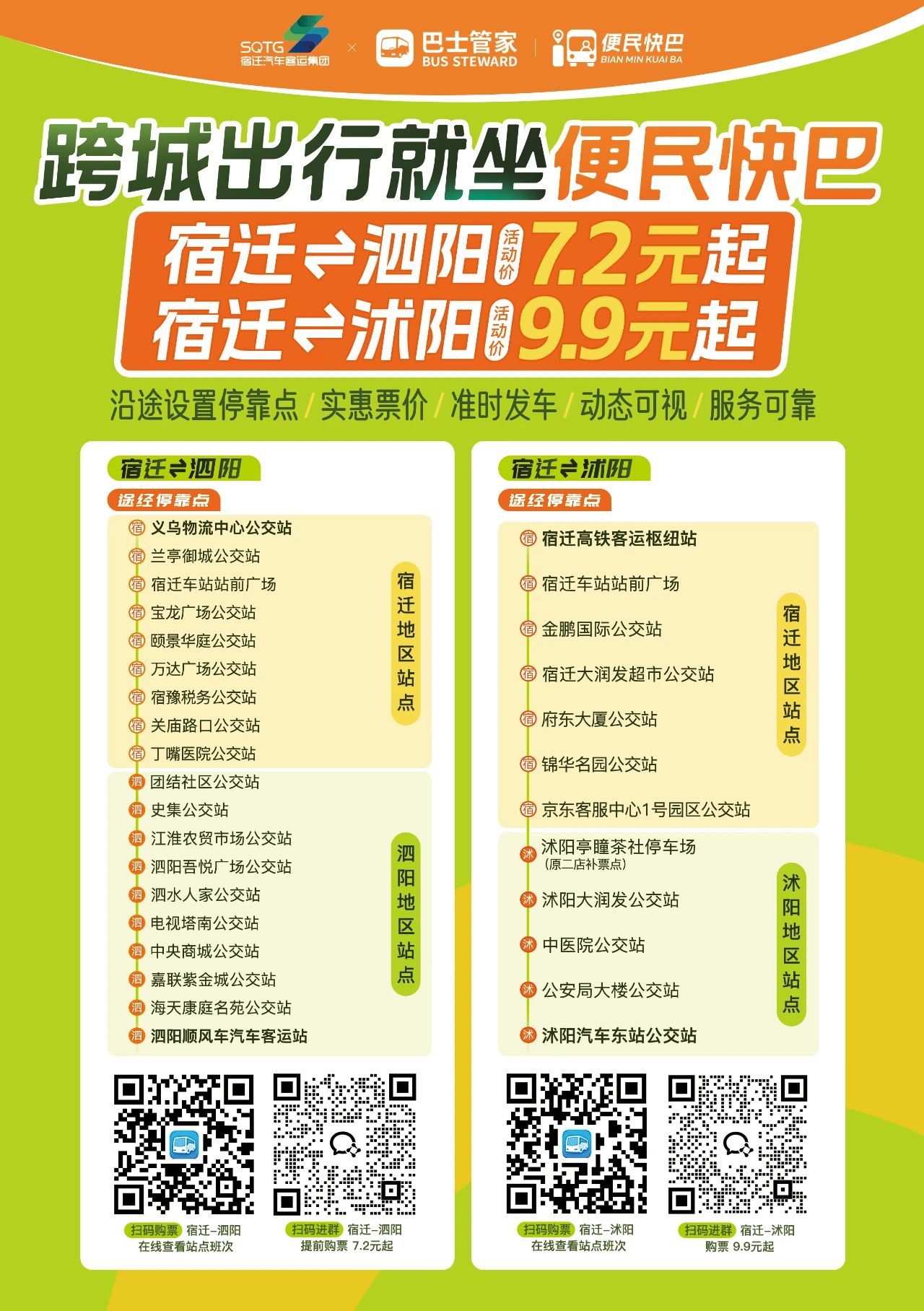【宿汽集团】沭阳9.9元、泗阳7.2元!宿迁“便民快巴”双线已开通,运营时间、站点最全清单来了