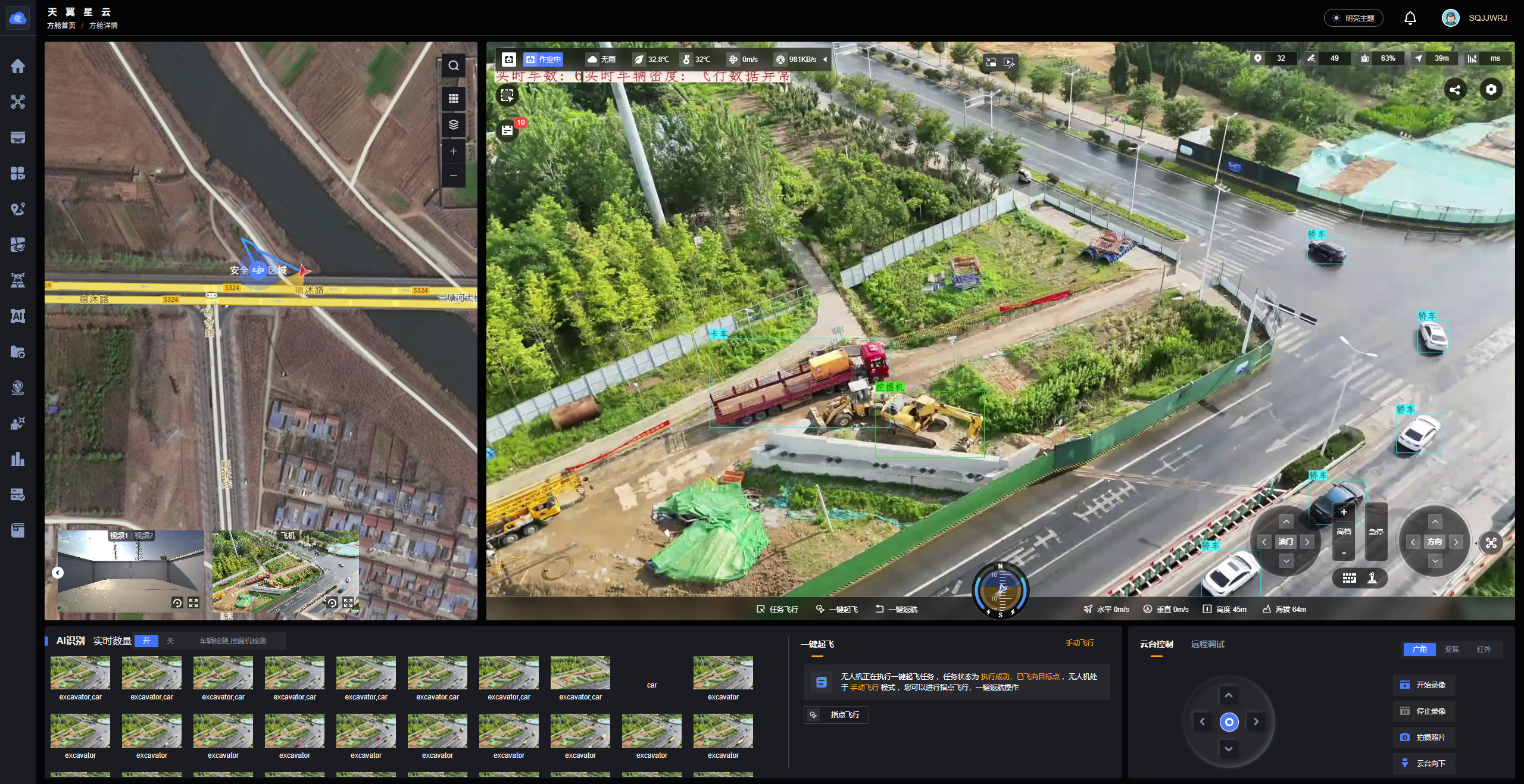 此外,在宿迁大道快速化改造工程3标,无人机正在代替安全员进行巡检,越是在施工忙碌的时候,无人机飞得更勤。它一路攀升到60米高空,项目施工进度、安全生产等情况全都被高清镜头“收入囊中”,化作实时数据流,飞速传输到市级飞控平台里,利用内置AI算法自动识别隐患行为,并自动标记位置、推送预警、督促整改,形成全链条管理闭环。