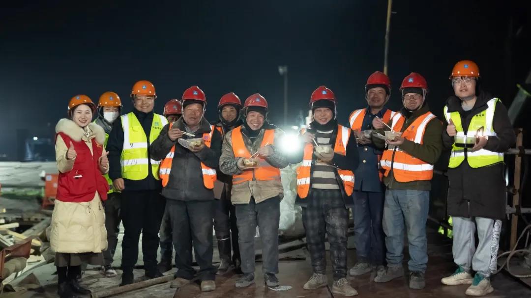 晚上组织志愿者为施工人员送上热烫的汤圆、饺子,驱散冬季的寒冷。