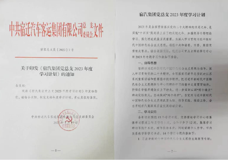 构建品牌“四梁八柱”学习制度。始终坚持把学习贯彻党的二十大精神作为首要政治任务,印发《宿汽集团党总支2023年度学习计划》,明确党建学习基础架构。