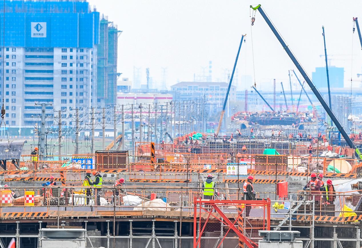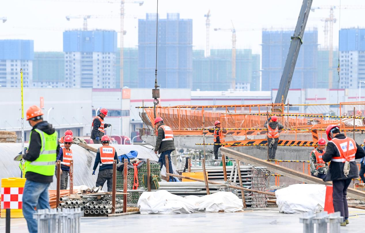 3月13日,在宿迁市酒都路(原张家港大道一期)快速化改造工程现场,塔吊林立、机械轰鸣,工人正在紧张施工。架设脚手架、墩柱浇筑、钢筋绑扎、混凝土浇筑作业交替进行,到处是一派热火朝天的景象。切割、焊接、敲打声此起彼伏,吊车、塔吊、挖掘机、装载机马力全开,正在有序作业。踏着春天的脚步,来自各地的工人在宿迁奏响“春之曲”,项目踏春提速,步伐奋进激昂,生动诠释了如何落实好高质量发展、构建好新的发展格局这一时代答卷。