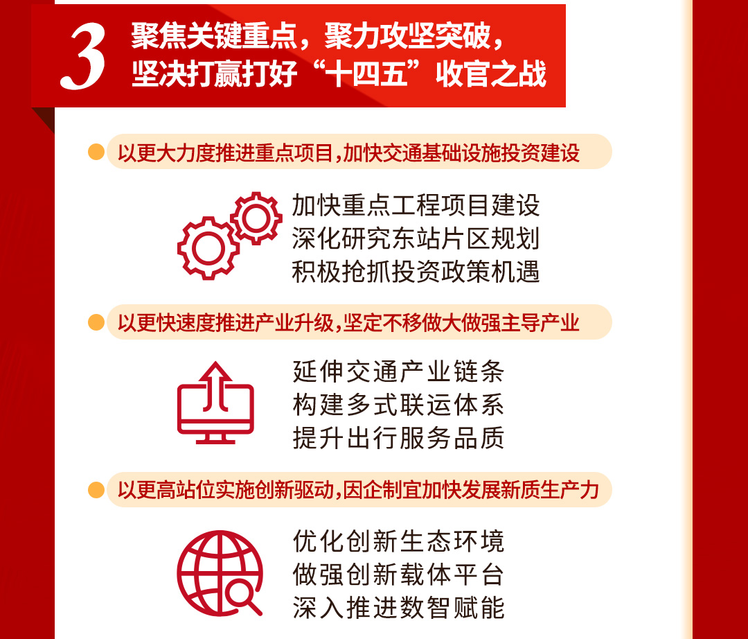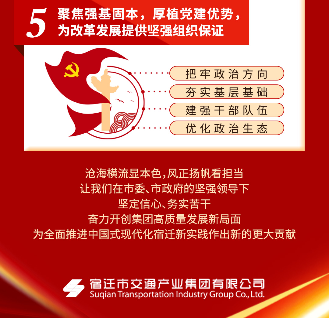 会议强调,2025年是“十四五”规划收官之年和“十五五”规划谋划之年,也是集团转型攻坚、加快发展的关键阶段,集团上下要聚焦增强核心功能、提高核心竞争力,聚力“高标准建设、高能级创新、高品质服务、高效能治理、高水平安全、高质量发展”,以更大力度推进重点项目、加快交通基础设施投资建设,以更快速度推进产业升级、坚定不移做大做强主导产业,以更高站位实施创新驱动、因企制宜加快发展新质生产力,以更实举措推动提质增效、多措并举优存量拓增量稳增长,以更强气魄深化改革提升、深度激发企业发展的内生动力,以更严要求防范化解风险、着力巩固高质量发展的坚强屏障,全力推动发展速度合理增长、产业结构不断优化、质量效益持续提升,奋力开创高质量发展新局面,为全面推进中国式现代化宿迁新实践作出新的更大贡献。