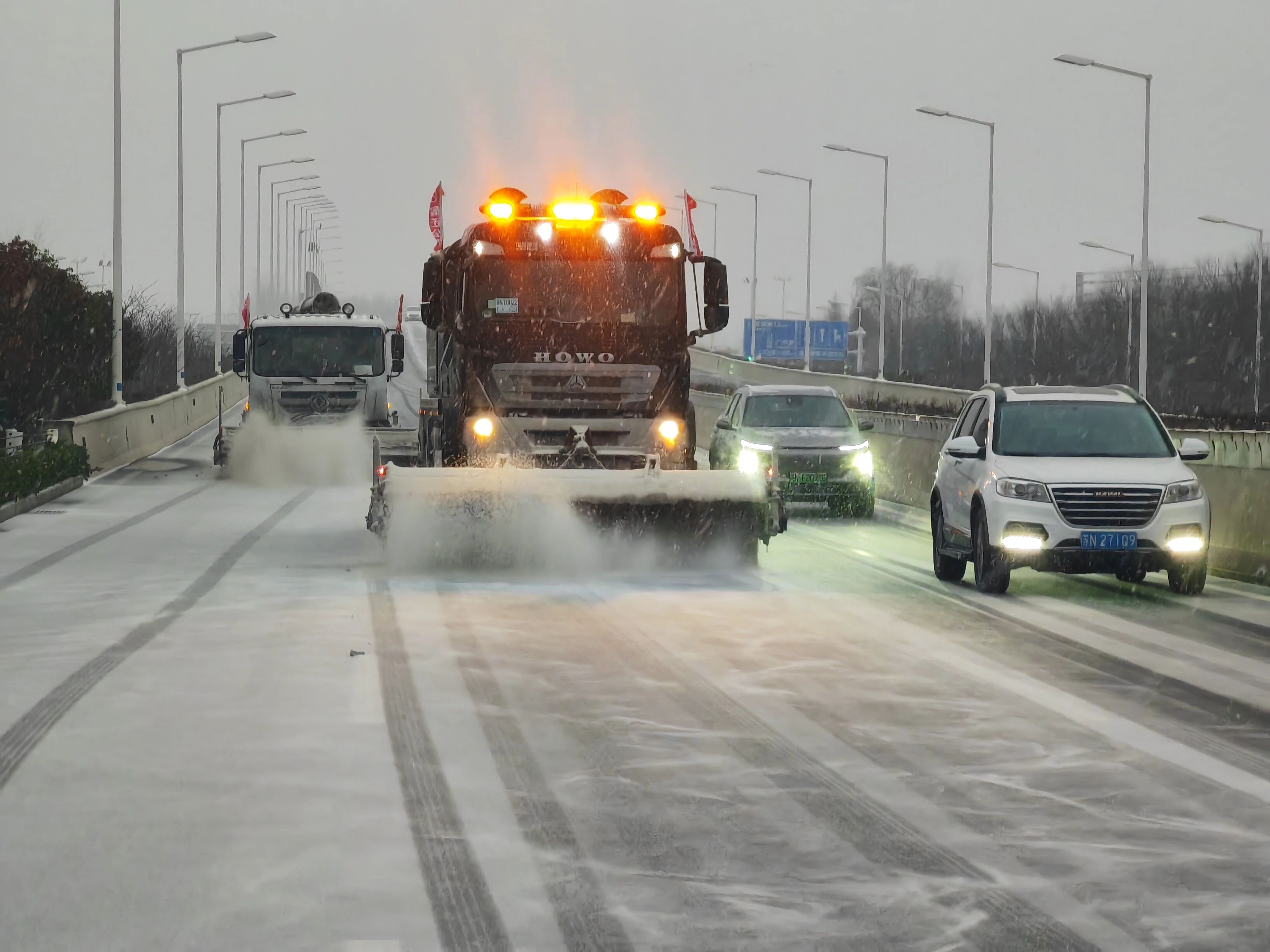 宿迁交建养护人员按照既定方案开展全方位作业,现场除雪车、撒布机编队协同,对管养路段展开循环除雪作业,20余台应急巡查车辆24小时不间断穿梭,同时借助路网全覆盖监控设备,实时排查路面积雪、结冰情况,做到“发现一处、清理一处、畅通一处”。