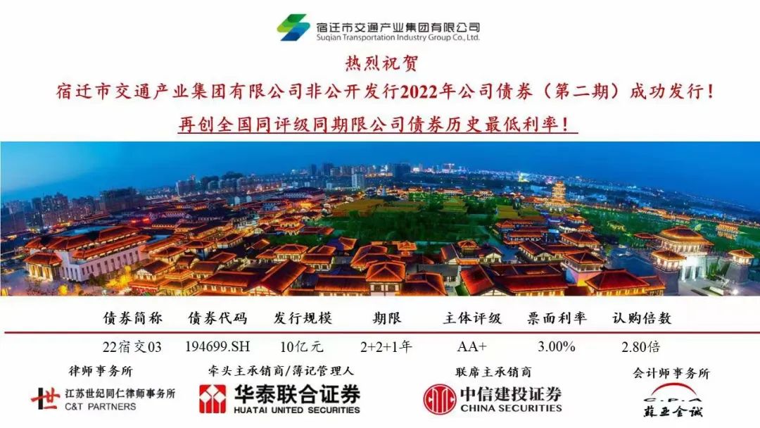 近日,集团非公开发行2022年公司债券第二期成功发行,发行规模10亿元,期限2+2+1年,由华泰联合证券、中信建投证券联合承销,票面利率3.00%,打破5月10日集团第一期3.08%发行利率,再创全国同评级同期限公司债券历史最低利率记录。