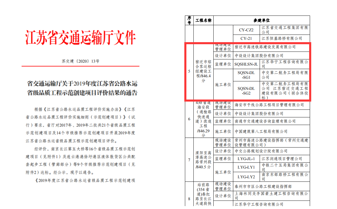 此次江苏省有9个市级推荐示范创建项目达标,由金都娱乐城 承建的宿迁市综合客运枢纽建设工程以846.4分荣获第五名。