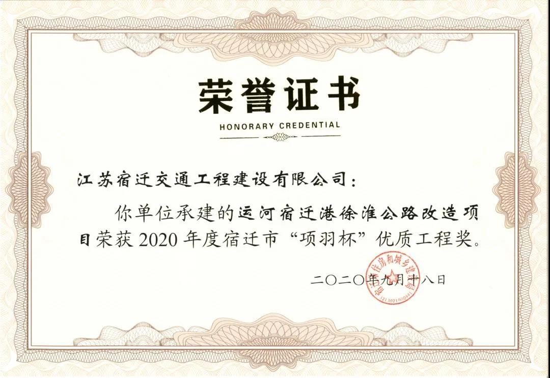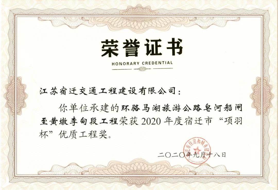 近日,由宿迁交建承建的环骆马湖旅游公路皂河船闸至黄墩李甸段工程和运河宿迁港徐淮公路改造项目荣获2020年度宿迁市“项羽杯”优质工程奖。