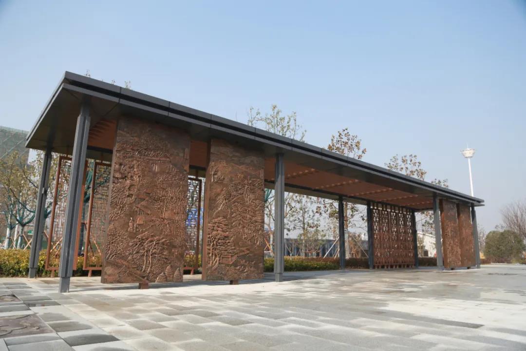 玖酒飘香浮雕的东西两侧,分别设计了长29米、高3.9米的文化长廊,其上各镶嵌了四幅宿迁历史人文美景雕板,由国家一级美术师、宿迁市政协副主席、民盟市委主委丁立江先生牵头,会同江苏省作家协会理事、宿迁市作家协会主席韩玉喜,中国书法家协会会员、江苏省书法家协会理事、宿迁市书法家协会主席张守跃,中国美术家协会会员郭鑫共同完成,每幅图样的创作都一一对应前人留下的诗句。相传“宿迁八景”出现于唐代,首载明万历《宿迁县志》,以后续修,皆有记载。“宿迁八景”即为:“宿预早春、白鹿渔歌、仓基莲唱、草埝耕云、龙泉夜雨、马陵秋月、梅村煮雪、司吾清晓”共八处风光。“八景”各具特色,景象殊奇,历代以来,项属之地文人雅士相聚于“八景”之地,曲水流觞,迎风弄月,留下了众多文化典故。