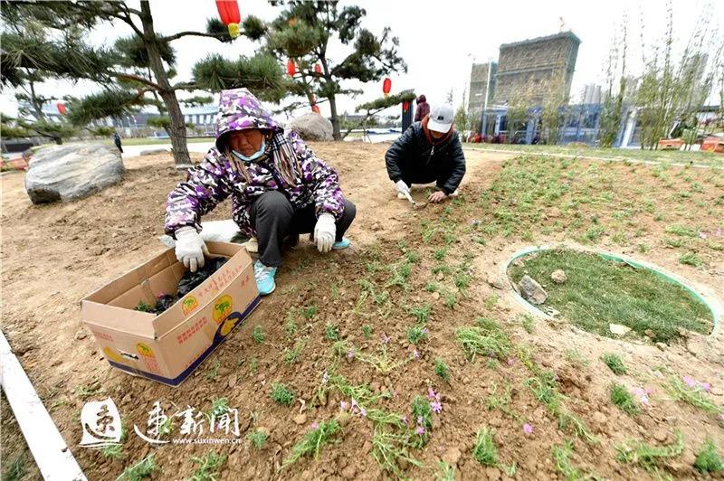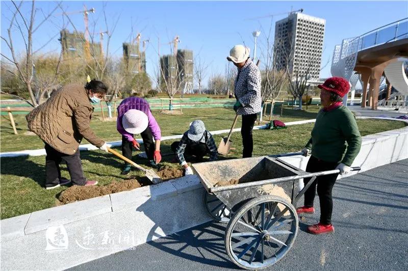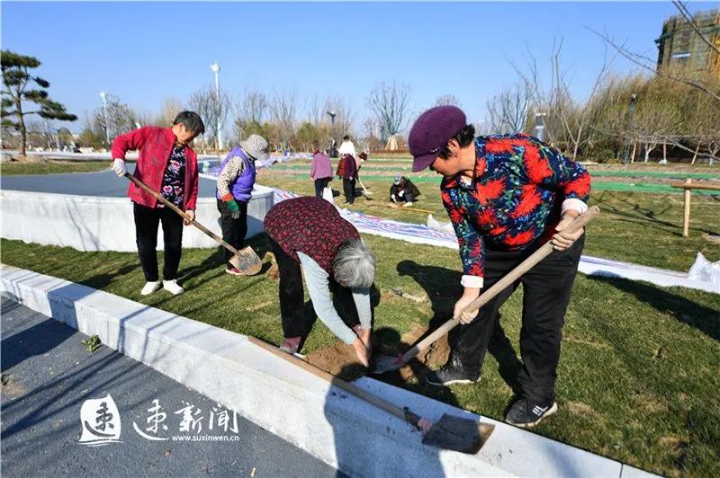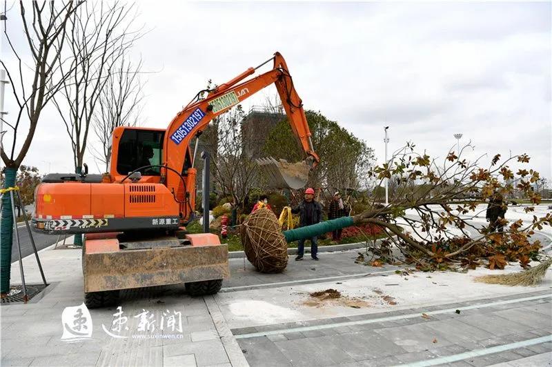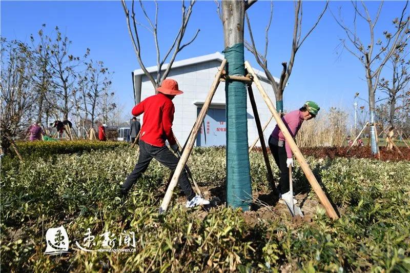 3月3日,工人在市高铁商务区酒都广场植树栽花。眼下已进入春季植树造林的好时节,连日来宿迁各地纷纷行动起来利用晴好天气参与植树,为酒都宿迁增添新绿。