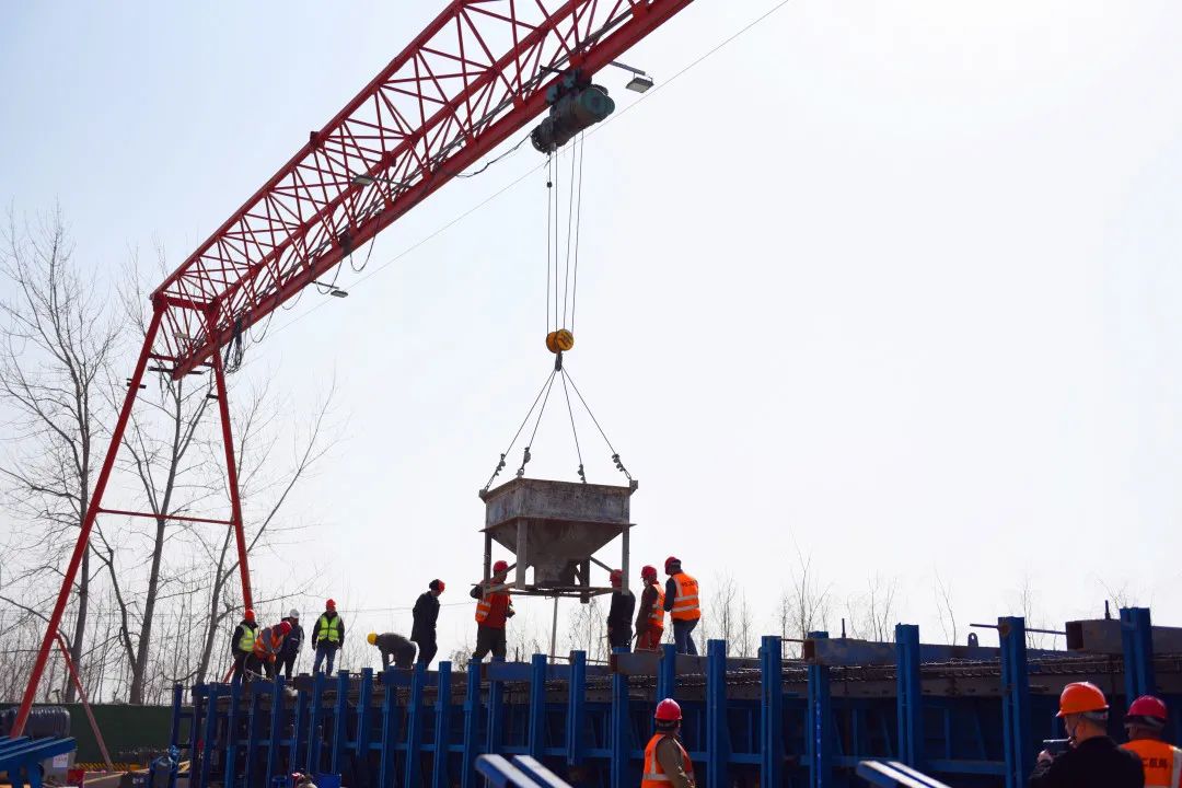据了解,北京路快速化改造工程桥梁上部结构形式多样,主要包含混凝土现浇箱梁、钢箱梁、整幅式网状吊杆系杆钢拱桥、预制箱梁及空心板梁,增加了工程整体施工难度。预制箱梁具备施工速度快,对地面交通和周围环境影响较小,且低碳环保的优点,可在梁场实现批量生产。为保证预制箱梁顺利施工,高铁公司、监理单位、质安中心及施工单位全力以赴组织协调各项工作,严格按照规范标准施工,多次组织作业人员进行安全交底、安全培训、技术交底、技术培训,做好首榀预制箱梁的各项准备工作,强化过程管控,确保安全、优质地完成首榀箱梁浇筑预制。