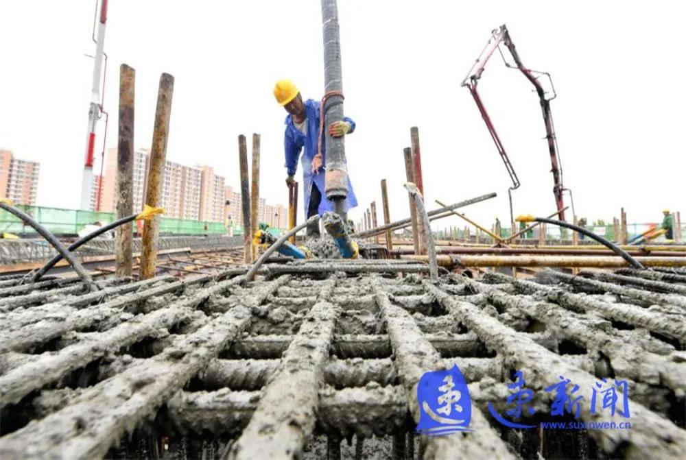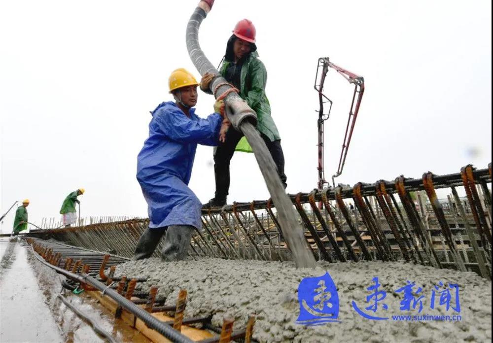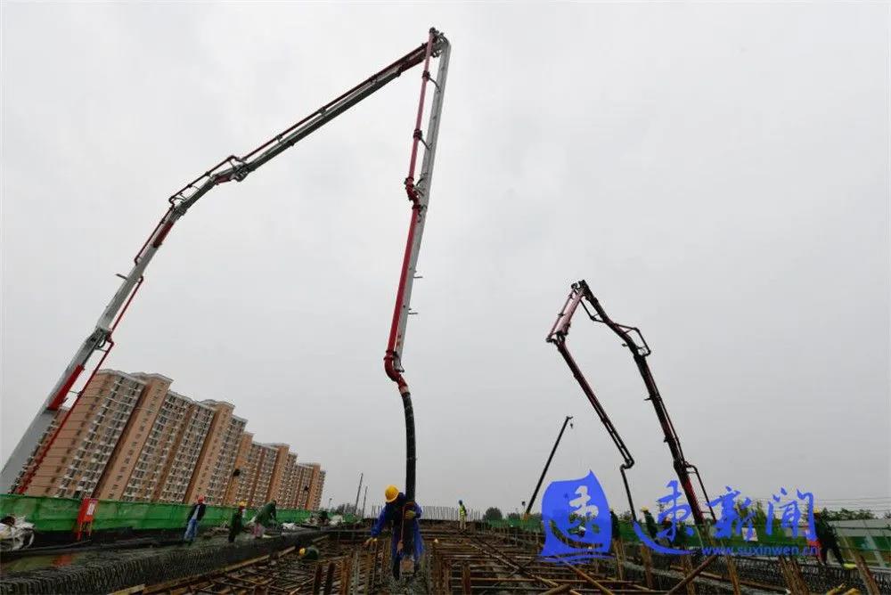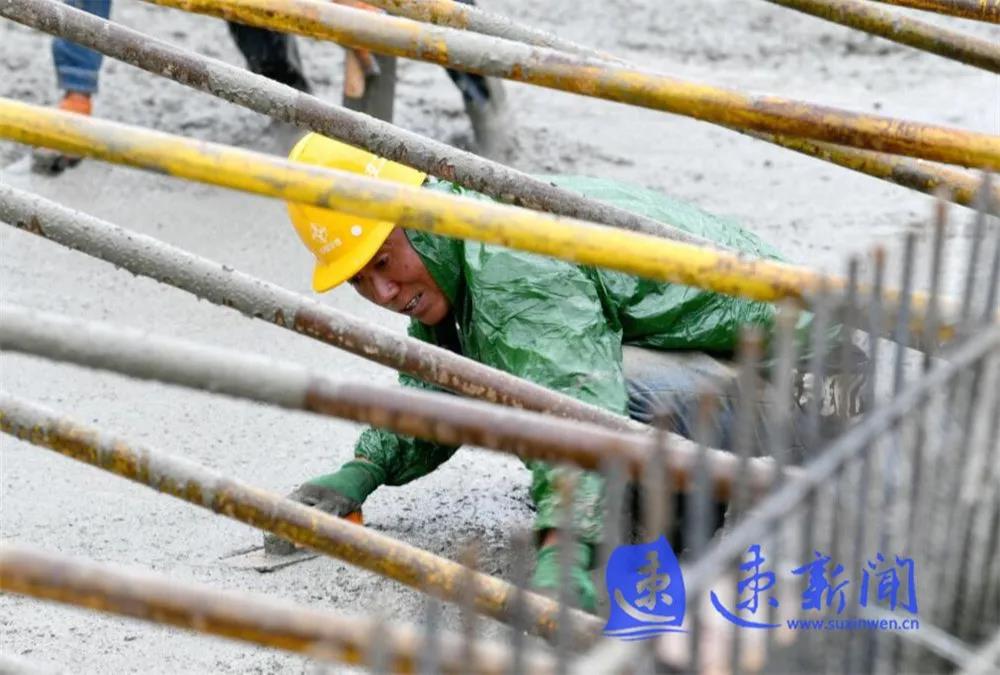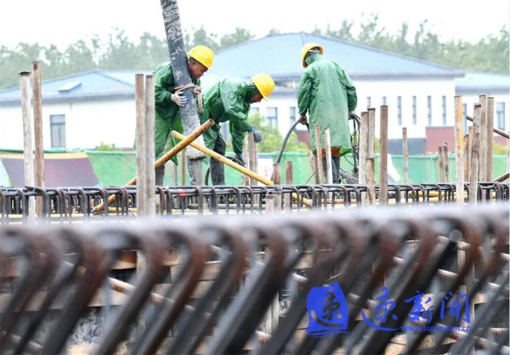 10月3日,宿迁市上海路(高铁站连接线)改造二期工程项目工地工人正在雨中进行施工作业,混凝土浇筑、起重机运转、工程车往返,呈现出一派热火朝天的劳动场景。