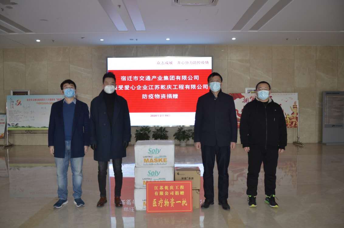 2月19日,爱心企业江苏乾庆工程有限公司将一批承载着对疫情防控一线人员满满关怀的防疫物资赠送给金都娱乐城 ,支援集团疫情防控工作,传递抗“疫”正能量。