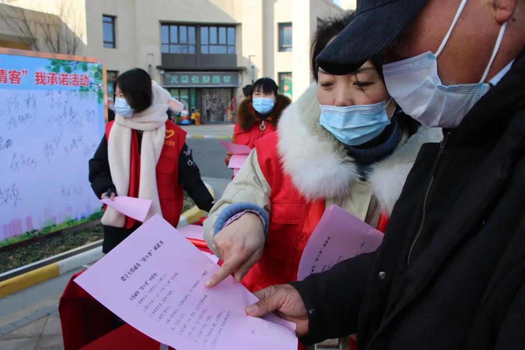 宿迁经开区黄河街道九鼎社区组织党员和“绿叶爱心志愿者”开展“防疫情 扬新风 过文明年”主题活动。