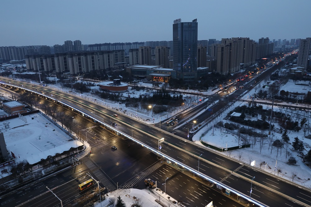 2月1日晚,雪势渐大市区快速路路面出现积雪、结冰情况为了城市的正常有序他们在风雪中执守