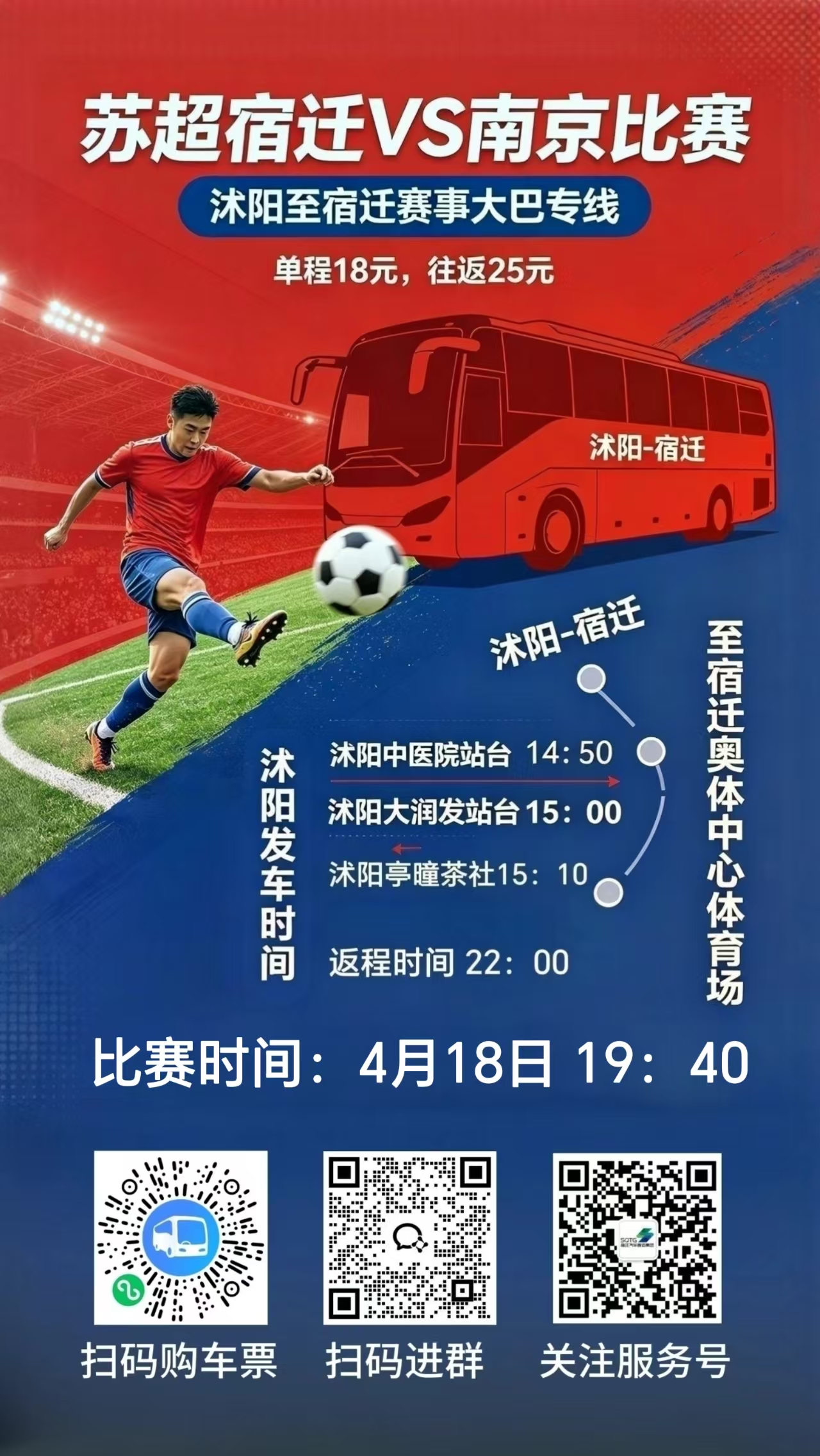 4月18日,为方便沭阳球迷轻松奔赴绿茵赛场,宿汽集团开通沭阳至宿迁奥体中心直通车,可通过线上“巴士管家”小程序、宿汽出行公众号、线下乘车购票。