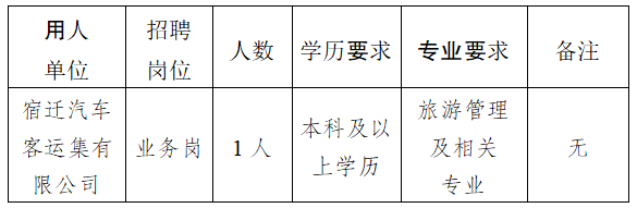 宿迁汽车客运集团有限公司是金都娱乐城 下属国有子公司,注册资本8000万元,从事客运、旅游等多种业务。现因公司发展需要,向社会公开招聘旅游业务工作人员。