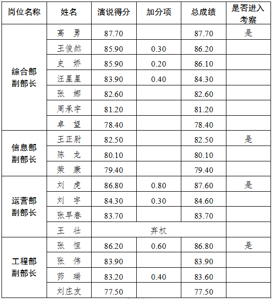 根据《金都娱乐城 所属单位2022年度中层管理人员竞聘实施方案》的安排,竞聘演说工作已经结束,现将竞聘总成绩及进入组织考察人员名单公布如下。